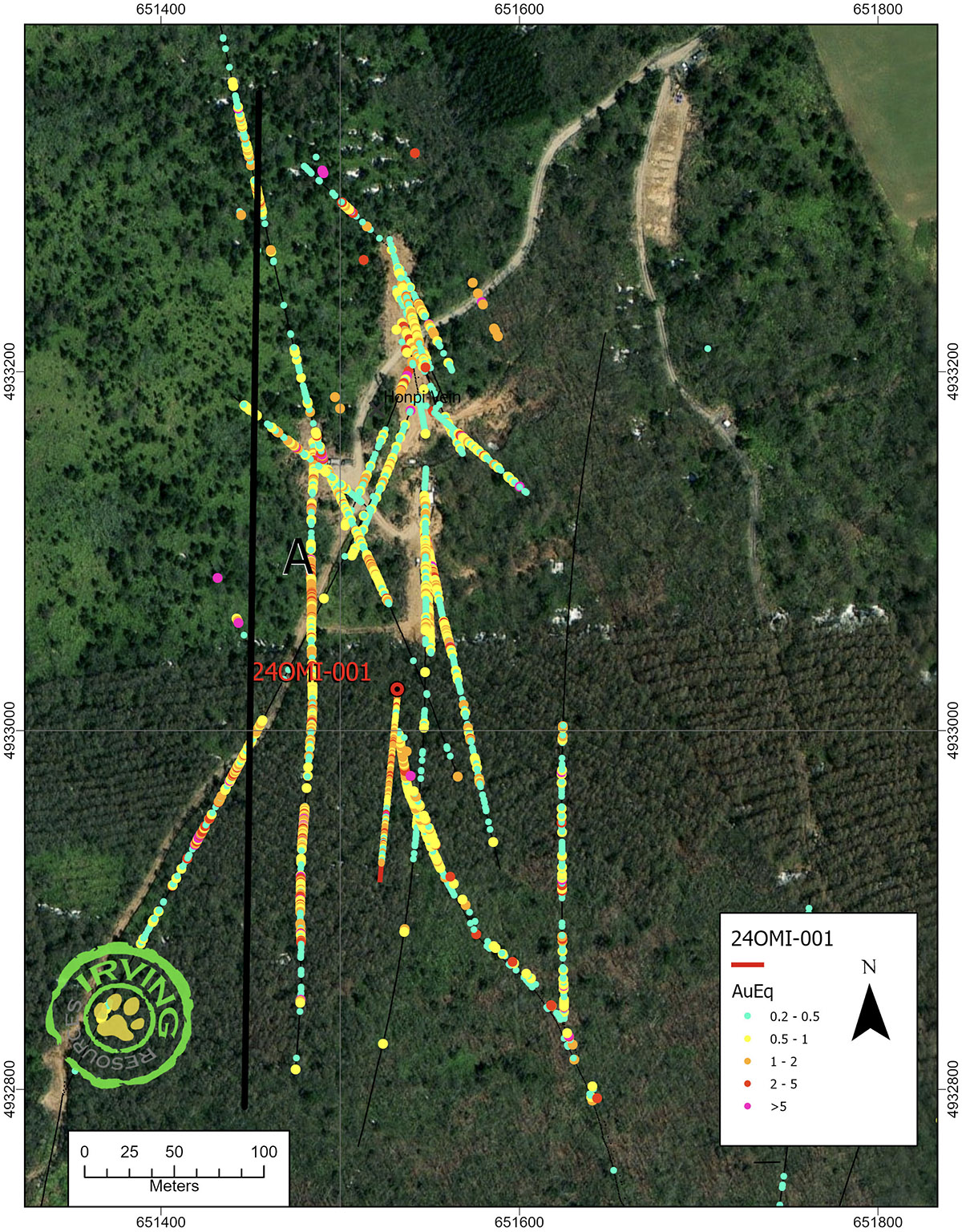 Figure 1 shows the location of hole 24OMI-001 and Figure 2 illustrates its cross-sectional position with respect to historic drill holes completed by Irving at Omui between 2019 and 2023. Hole 24OMI-001 encountered a 101.1m-wide intercept of silicified rocks grading 1.14 gpt Au, 16.0 gpt Ag and 84% silica. There are no other holes in the immediate area of 24OMI-001 at this time. Based upon the pervasive nature of silicification observed in this interval, Irving believes there could be significant potential to find larger volumes of gold-rich silica in this area.