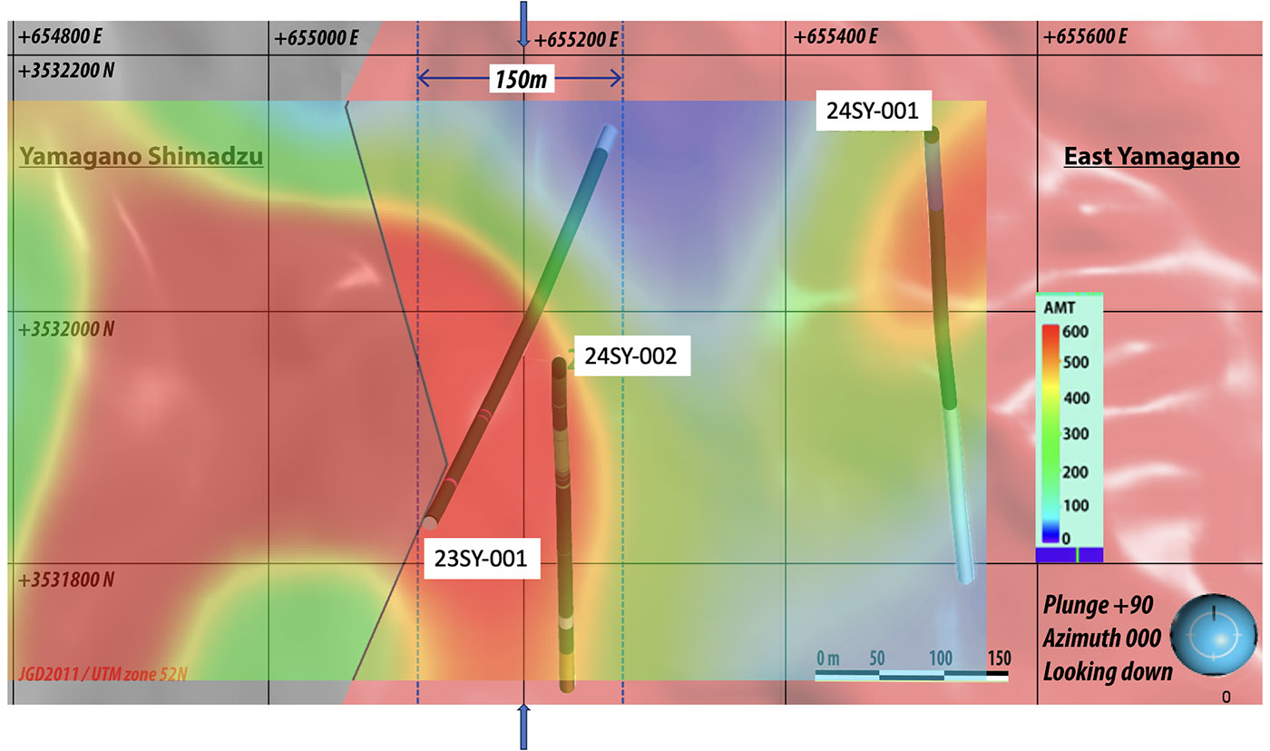 (Figure 3: Plan view of drill holes 23SY-001 and 24SY-002 at East Yamagano with AMT resistivity data in colors as a backdrop. The section line for Figure 4 is highlighted with blue arrows.)