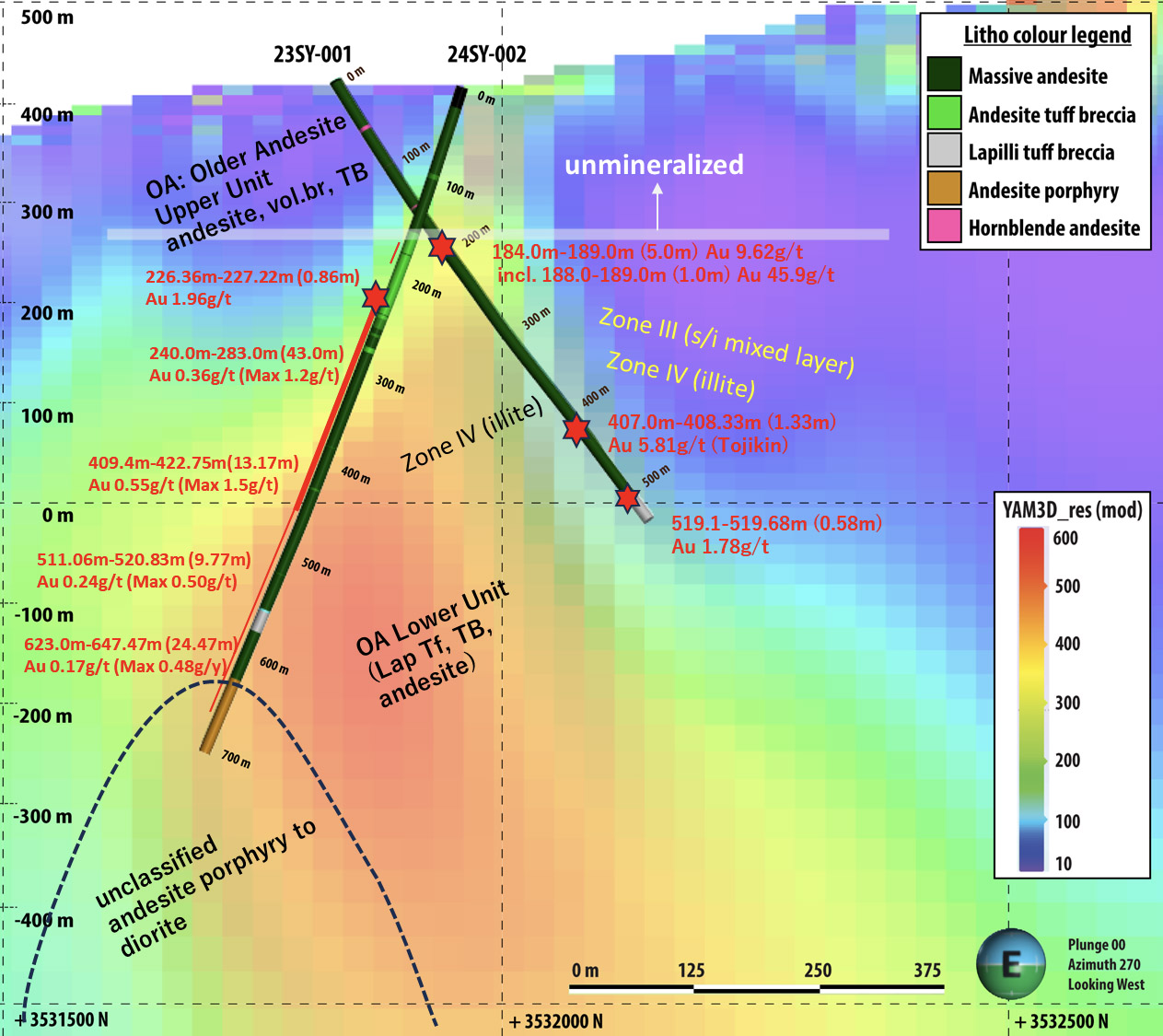 In the fourth quarter of 2024, Irving initiated drilling of its third diamond drill hole at East Yamagano, 24SY-002, a south-oriented 702.1m deep drill hole inclined at -70 degrees designed to test a steeply oriented electrically resistive zone evident in AMT data (Figures 3 and 4). This hole was completed in the middle of February 2025. Figure 3 shows a plan view of the drill trace of hole 24SY-002 and Figure 4 shows a sectional view of this hole overlain on AMT resistivity data. It is evident that 24SY-002 paralleled the southern margin of the targeted resistive zone. Although this hole did not encounter any high-grade veins, several broad zones of silicification and anomalous levels of gold, generally ranging between 0.1 and 1 gpt Au, were intersected between 226-278m, 292-314m, 409-442m and 623-648m. The highest-grade individual vein that was intersected ran 1.90 gpt Au over 0.86m starting at 226.36m.