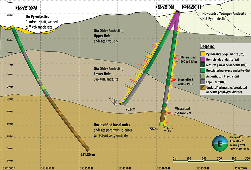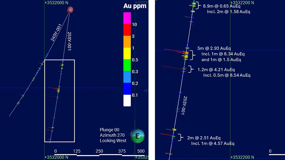 (Figure 3: North-south cross sectional view of holes 25SY-001 and 24SY-001 looking west. Gold intercepts are denoted in colors, and a magnified image of the most significant portion of hole 25SY-001 is shown at right.)