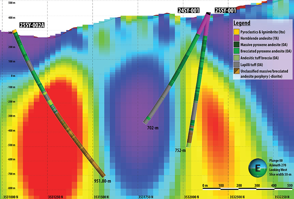 Hole 25SY-001 is oriented in a southerly direction at a steep inclination of 82 degrees reaching a depth of 752 metres (Figures 1-3). This hole is drilled from the same drill pad as hole 24SY-001, a southerly oriented 702.1-metre long hole drilled at a shallower inclination of 65 degrees. Hole 24SY-001 encountered anomalous gold mineralization discussed in the Company’s news release dated May 5, 2025. Given the strong geologic indicators observed in hole 24SY-002 as well as the presence of a deeper resistive feature evident in AMT data, the JV geologic team thought that drilling a steeper hole in this same location was warranted, hence the reasoning behind drilling hole 25SY-001.