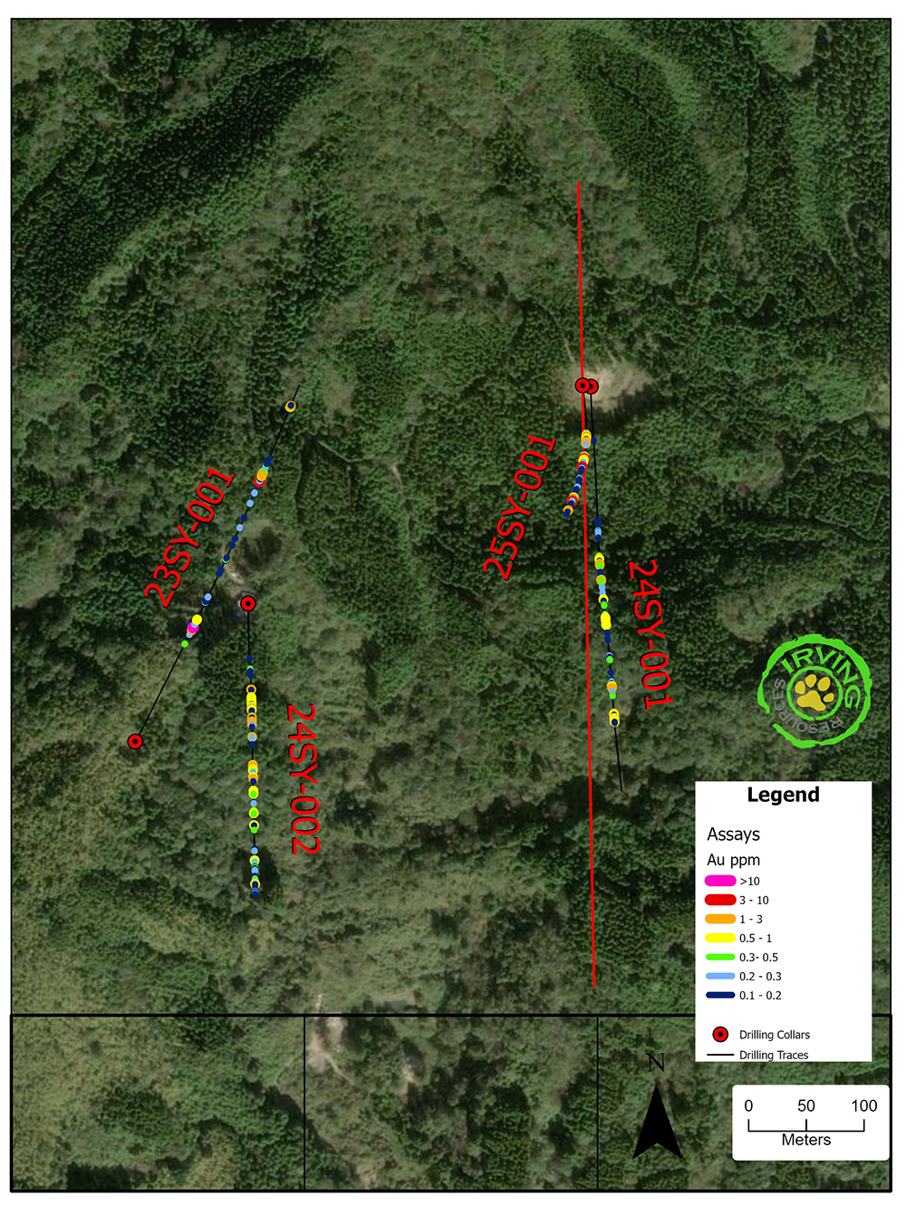 In addition to higher gold values, the degree of silicification in hole 25SY-001 is notably higher than that observed in hole 24SY-001. Current thinking by Irving’s geologic team is that potential remains for improved gold grades as well as structural widths of vein zones deeper within the AMT resistive zone in this area. Consideration is being given to potentially conducting further drilling in this area.