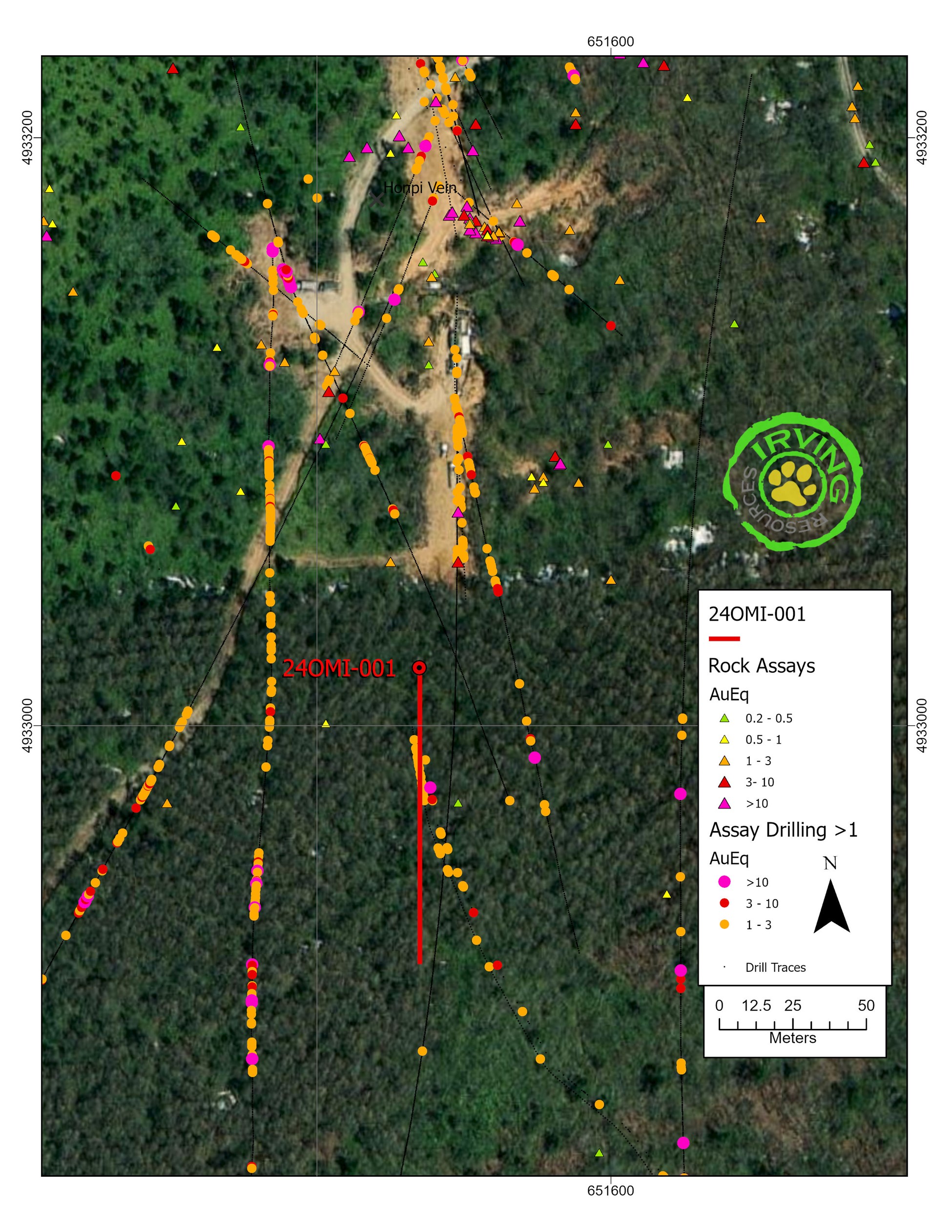 In November, immediately following the consummation of an option agreement with JX Advanced Metals Corporation (“JX”) over select areas at the Omu gold project (refer to the Company’s news release dated November 13, 2024), Irving, under the direction of JX, drilled a single, strategically positioned diamond drill hole, 24OMI-001, at the Omui historic mine site (Figure 1). This hole was shallowly oriented toward the south testing an area up to approximately 150m south of Honpi, the main vein that was mined during the 1930’s. Beginning at approximately 35m down hole depth, hole 24OMI-001 encountered extensive quartz veining and silicification to the end of the hole at 101m. The objective of this hole was to determine if there are shallow, gold-bearing quartz veins and silicified ore that could potentially be exploited by surface mining. This work is viewed as part of the vision to make Omu into a new source of gold-bearing silica flux for use in smelters in Japan. Irving is encouraged by the visual results from this drill hole which is currently being logged, sawn and sampled for assay. During 2025, JX and Irving plan to drill an additional three such holes testing more parts of Omui for shallow veins and silicified ore.